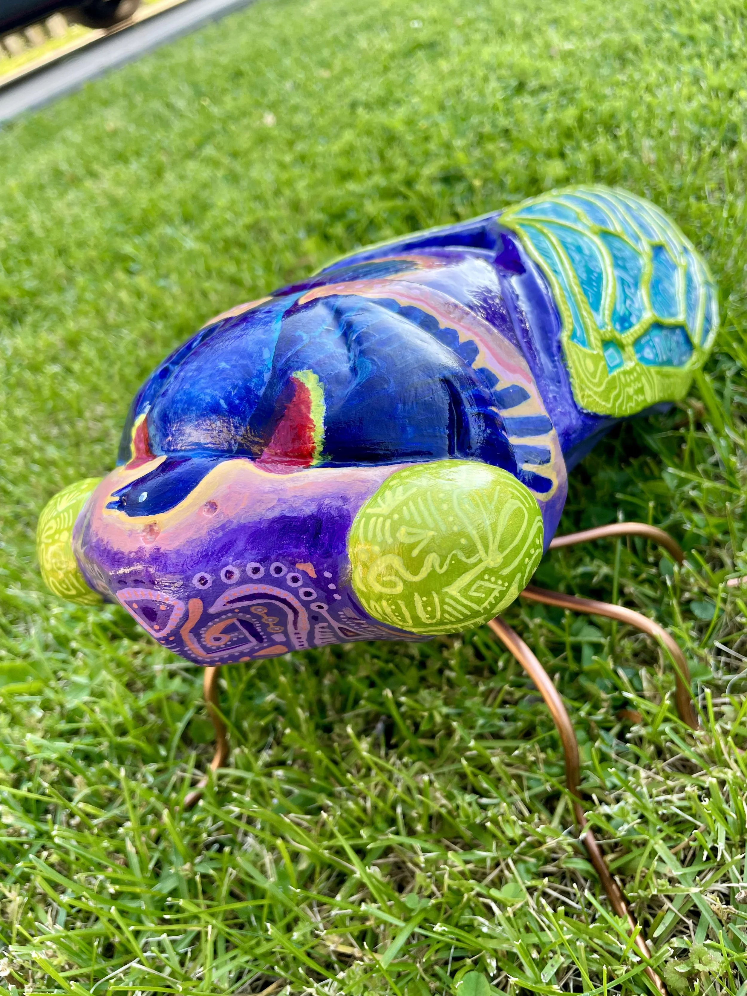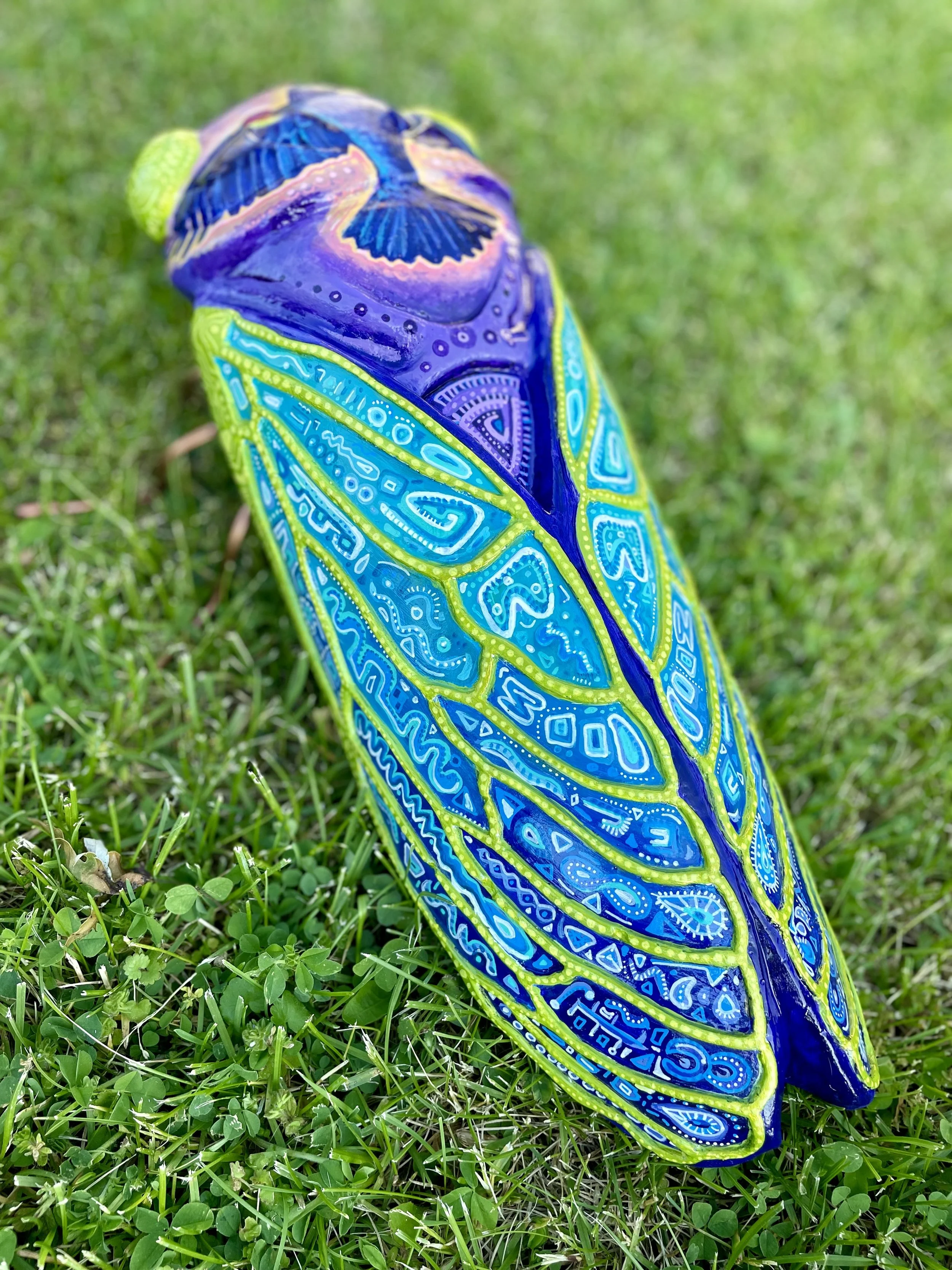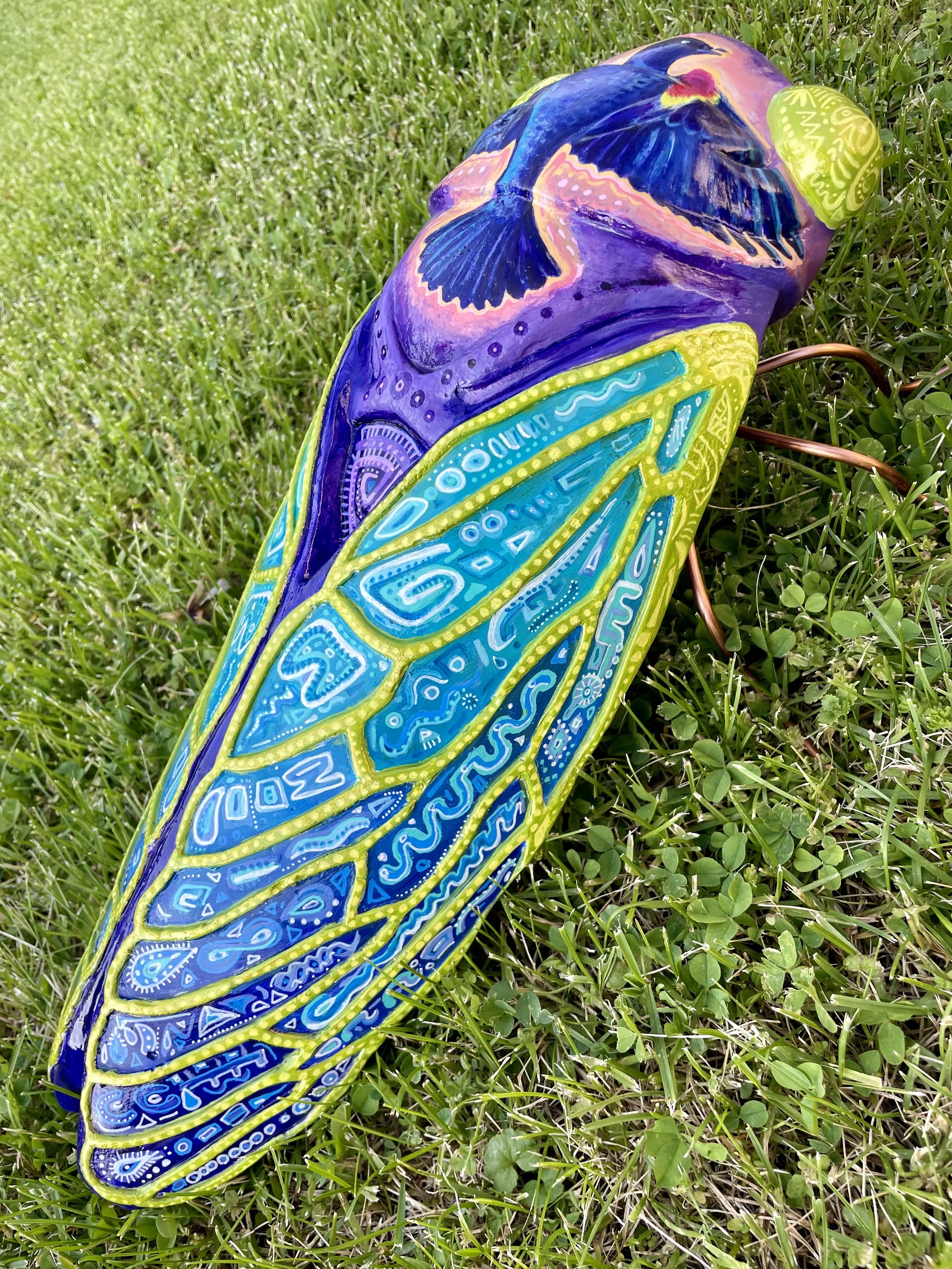 Celia the Cicada - Sponsored piece for the 2024 Chicago Cicada Parade-a. Acrylic and marker on plaster sculpture.